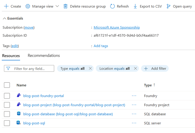 It’s the same deal with Foundry: once you have a Project provisioned, that’s where all your robots will live. In fact, just as SQL database PaaS instances are listed in a resource group as “[sql-database-name]([sql-server-name]/[sql-database-name]),” Foundry Project resources follow the same naming convention: “[foundry-project-name]([foundry-portal-name]/[foundry-project-name]).”