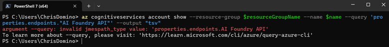 PS C:\Users\ChrisDomino> az cognitiveservices account create --resource-group $resourceGroupName --name $name --location $region --custom-domain $name --kind "AIServices" --sku $sku --query "id" --output "tsv" --manage-projects --assign-identity --yes