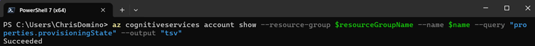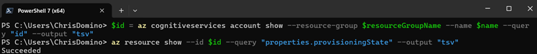 PS C:\Users\ChrisDomino> az cognitiveservices account create --resource-group $resourceGroupName --name $name --location $region --custom-domain $name --kind "AIServices" --sku $sku --query "id" --output "tsv" --allow-project-management --assign-identity --yes