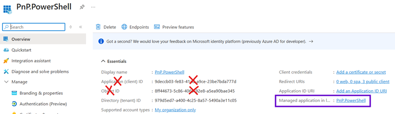 Basically, the app registration is the app itself, where engineers configure permissions, APIs, authentication, etc. The corresponding Enterprise application is the service principle, similar to a PaaS managed identity. Let’s take a look at my old friend, PnP PowerShell, as an example. Here’s the app registration…