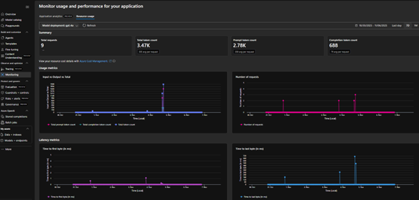 By following these various processes, you will also see some data on under the Monitoring Dashboard, where you can review details like Operational Metrics under Application analytics tab and resource level metrics under Resource usage Tab. We’ll cover more details for how to configure Evaluation metrics in next blog in this series.