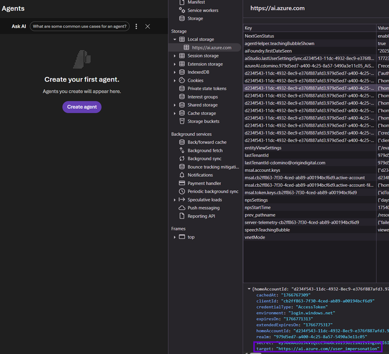 22. . . .The magic happens on Line# 17 above. The current user’s bearer token, which contains their identity, is exchanged for a new token against a somewhat odd scope…not one that you will see when configuring security for Foundry or an Entra ID app. I got lucky and found this by logging into my Foundry Project browser UI and trolling my tokens in local storage:
