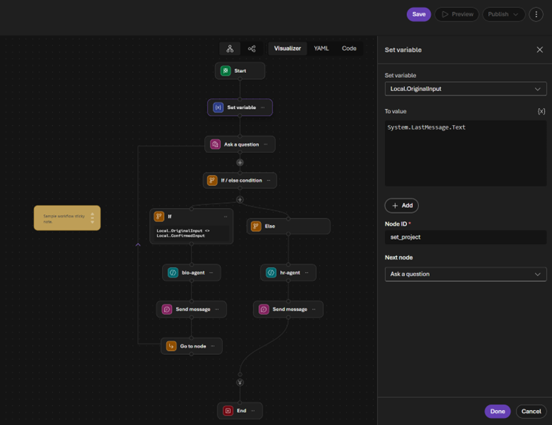 Foundry provides a “diet” Power Automate type of experience for creating workflows: we “code with our mouses” to create sequential, branching nodes that can invoke agents, ask the user a question, or perform procedural logic (if/else statements, for each loops, variable manipulation via a subset of PowerFx commands, etc.).