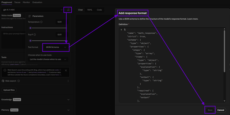 To do this, head back to Foundry, load up an agent, and click the parameters button at the top. Then select “JSON Schema” from the “Text format” drop down, and a modal will be displayed asking for your schema. The JSON that describes your output is quite stringent; you must specify the “strict”:true property/value and include all fields in the “required” array. Also note that the root element must be an object.