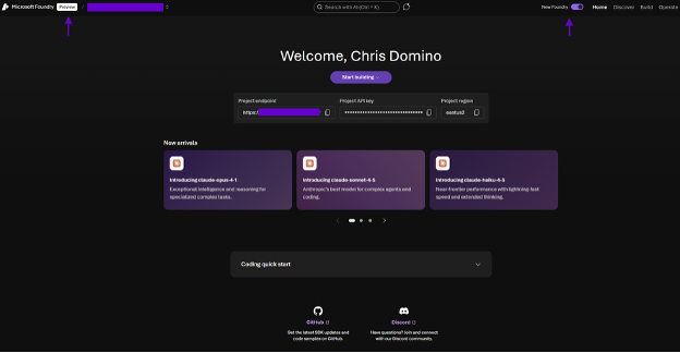 2. The new interface is stunning, providing a welcome screen instead of throwing you directly into the tooling. The arrows below call out the preview status of the “New Foundry” interface and how to opt into it.