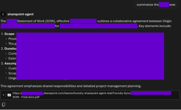 And there it is! Without a single line of code or needing any knowledge of RAG techniques, we have an AI agent reasoning over SharePoint content. The old interface had some cryptic steps (such as having to mark the site collection URL as a secret), but this process was faster and more intuitive; it was fun in a new kind of way.